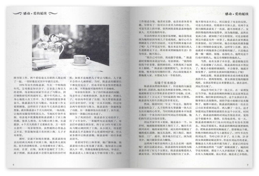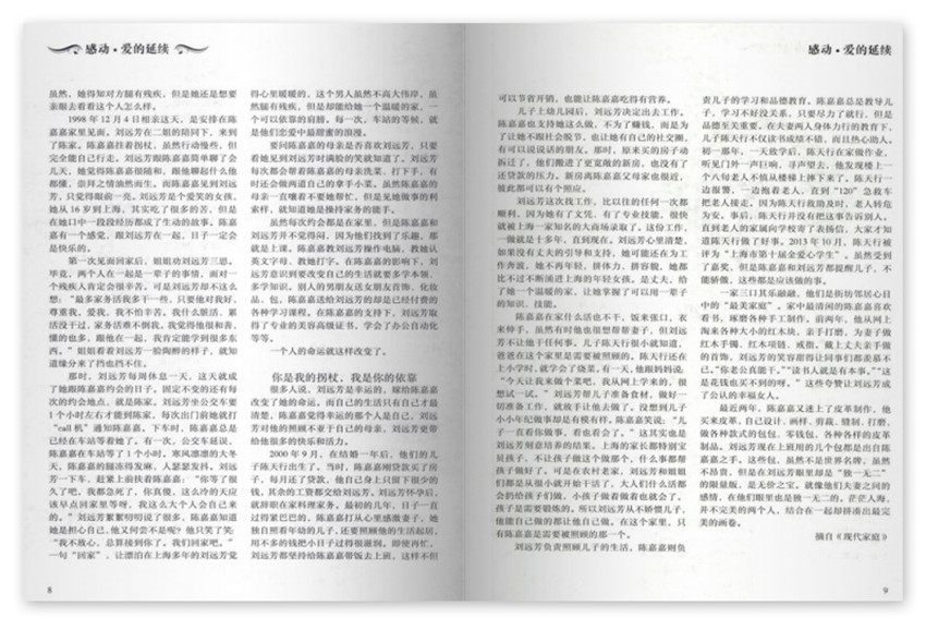 你是我的拐杖,我是你的依靠,很多人說,劉遠芳是幸運的,嫁給陳嘉嘉改變了她的命運。而自己的生活只有自己才清楚,陳嘉嘉覺得幸運的那個人是自己,劉遠芳對他的照顧不亞于自己的母親,劉遠芳更帶給他很多的快樂和活力。2000年9月,在結(jié)婚一年后,他們的兒子陳天行出生了。當(dāng)時,陳嘉嘉剛貸款買了房子,每月還了貸款,他自己身上只留下很少的錢,其余的工資都交給劉遠芳。