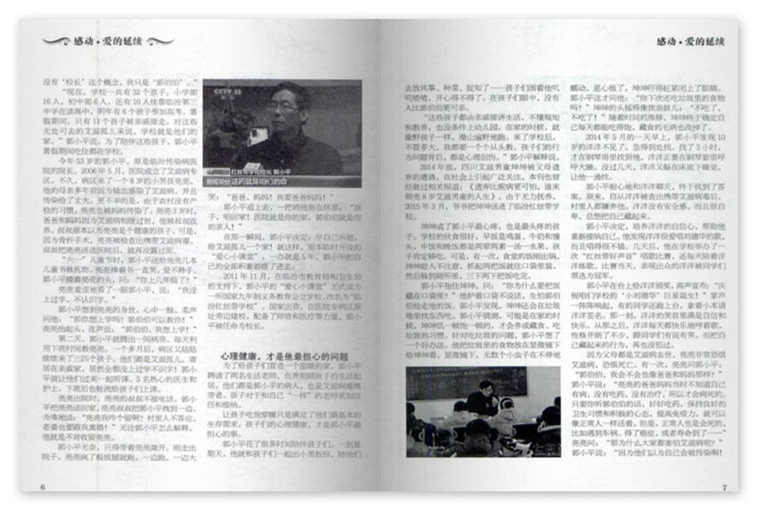 心理健康,才是他擔(dān)心的問題為了給孩子們營造一個溫暖的家,郭小平聘請了兩名生活老師,負貴照顧孩子的生活起居。他們都是郭小平的病人,也是艾滋病毒攜帶者。孩子對于和自己“一樣”的老師更加信任和接納。讓孩子吃飽穿暖只是滿足了他們基本的生存需求。孩子們的心理健康,才是郭小平擔(dān)心的事。郭小平花了很多時間陪伴孩子們,一到星期天,他就和孩子們一起出小黑板報,陪他們。