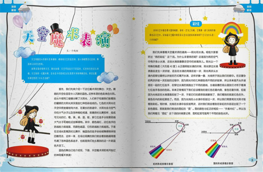 翻開《百科探秘》,映入眼簾的不是說教味濃的詞匯,不是艱澀難懂的科學(xué)術(shù)語,而是簡潔易懂、充滿童趣的文字,曼妙唯美、清新亮麗的圖畫。每期的“世界真奇妙”讓小讀者足不出戶就能知曉重大中外歷史事件和重要科學(xué)技術(shù)發(fā)展,了解世間萬物的來龍去脈,探索大自然的神奇奧秘,成為真正的“科普小達(dá)人”。