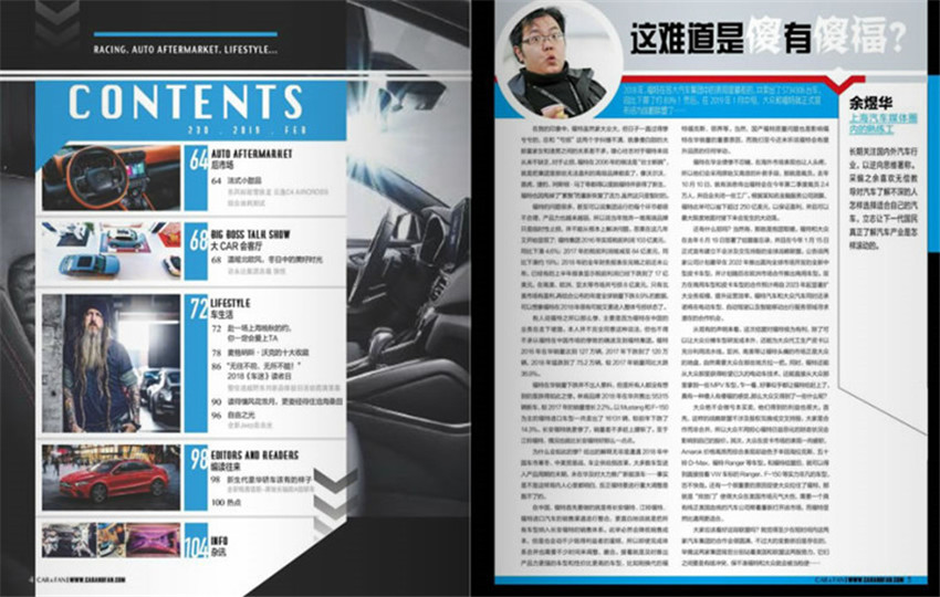 《車迷》創(chuàng)辦于1999年,月刊,單期128頁,《車迷》是一本結(jié)合高定位的實(shí)用性的汽車雜志,站在車迷閱讀興趣的角度,從評車、品車到玩車,展現(xiàn)駕駛的樂趣。