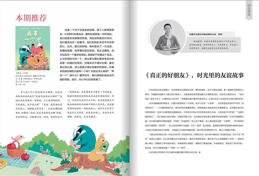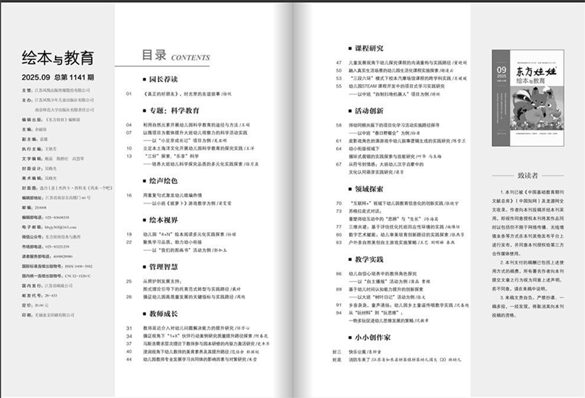 雜志聚焦3-6歲幼兒發(fā)展需求,嚴(yán)格遵循學(xué)前教育五大領(lǐng)域(健康、語言、社會(huì)、科學(xué)、藝術(shù))的發(fā)展目標(biāo),設(shè)置了“小茶聊讀書”“課程故事”“教育探索”“小小創(chuàng)作家”等核心欄目。其中“課程故事”欄目通過真實(shí)教學(xué)案例解析繪本與課程的融合路徑,“教育探索”板塊則邀請(qǐng)國內(nèi)外幼教專家探討前沿教育理念,而“小小創(chuàng)作家”欄目鼓勵(lì)幼兒發(fā)揮想象力,將閱讀體驗(yàn)轉(zhuǎn)化為創(chuàng)意表達(dá),實(shí)現(xiàn)從“讀繪本”到“用繪本”的價(jià)值延伸。