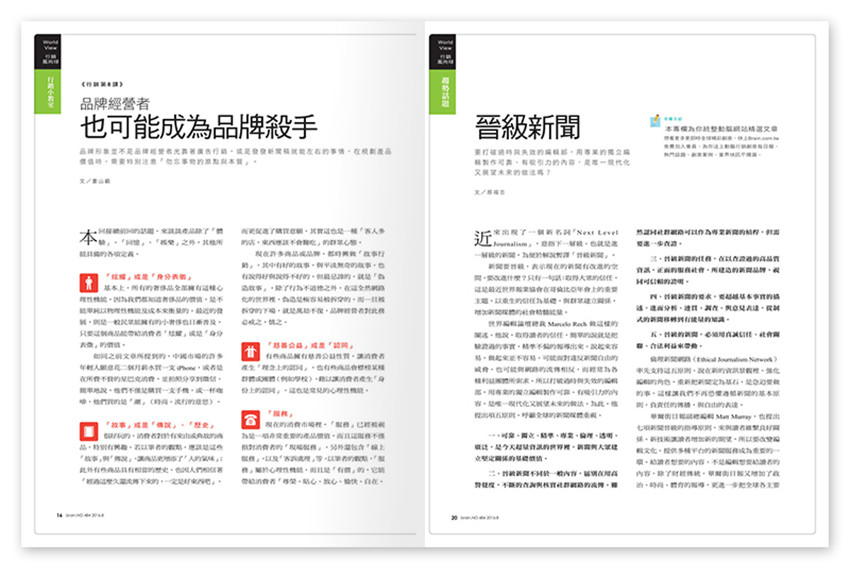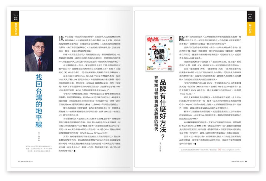 《動(dòng)腦》多元豐富的產(chǎn)品除雜志外,另有Brain.com數(shù)數(shù)位平臺(tái)、動(dòng)腦講座、及動(dòng)腦俱樂(lè)部、叢書(shū)出版、動(dòng)腦考察團(tuán)及廣告獎(jiǎng),滿足讀者各項(xiàng)需求。,廣告行銷媒體圈瞭望者的角色;讀者涵蓋臺(tái)、中、港、新、馬、美國(guó)等地華文廣告界。