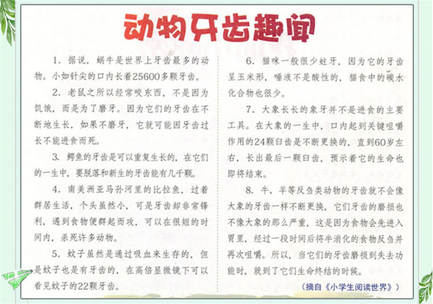 沒有規(guī)矩,不成方圓。1.據(jù)說,蝸牛是世界上牙齒超多的動物。小如針尖的口內(nèi)長著25600多顆牙齒。2.老鼠之所以經(jīng)常咬東西,不是因?yàn)轲囸I,而是為了磨牙。因?yàn)樗鼈兊难例X在不斷地生長,如果不磨牙,它就可能因牙齒過長不能進(jìn)食而死。