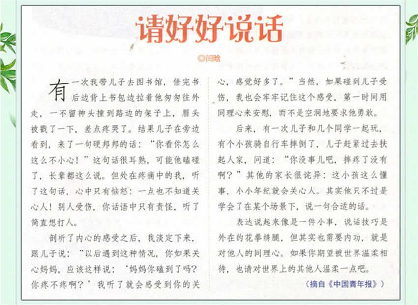 動物牙齒趣聞,有后邊背上書包邊拉著他匆匆往外走,一不留神頭撞到路邊的架子上,眉頭被戳了一下,差點(diǎn)疼哭了。結(jié)果兒子在旁邊看到,來了一句硬邦邦的話:“你看你怎 么這么不小心!”這句話很耳熟,可能他磕碰了,長輩都這么說。但處在疼痛中的我,聽了這句話,心中只有惱怒:一點(diǎn)也不知道關(guān)心人!別人受傷,你話語中只有責(zé)怪,聽了簡直想打人。