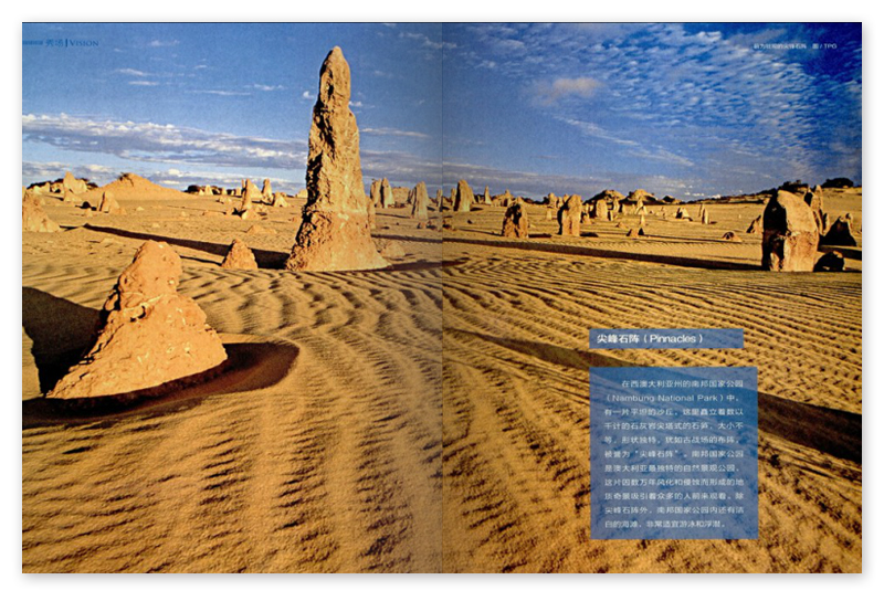 峰石陣,在西澳大利亞州的南邦國家公園中,有一片平坦的沙丘,這里矗立著數(shù)以干計的石灰?guī)r尖塔式的石筍,大小不等,形狀獨特,猶如古戰(zhàn)場的布陣,被譽為“尖峰石陣南邦國家公園是澳大利亞獨特的自然景觀公園,這片因數(shù)萬年風化和侵蝕而形成的地質奇景吸引著眾多的人前來觀看。
