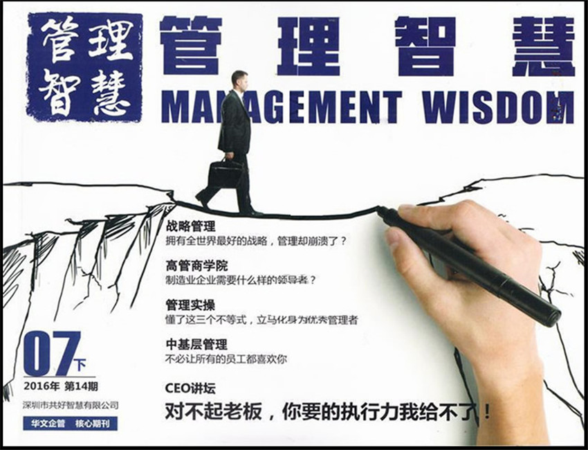 《管理智慧》雜志是深圳市共好資訊有限公司與中國文聯(lián)主管的《神州》雜志社共同研發(fā)的“華文企管《智慧??贰毕盗兄唬菄鴥?nèi)價格較高、不刊登廣告、憑精到實用的內(nèi)容取勝的經(jīng)管雜志。