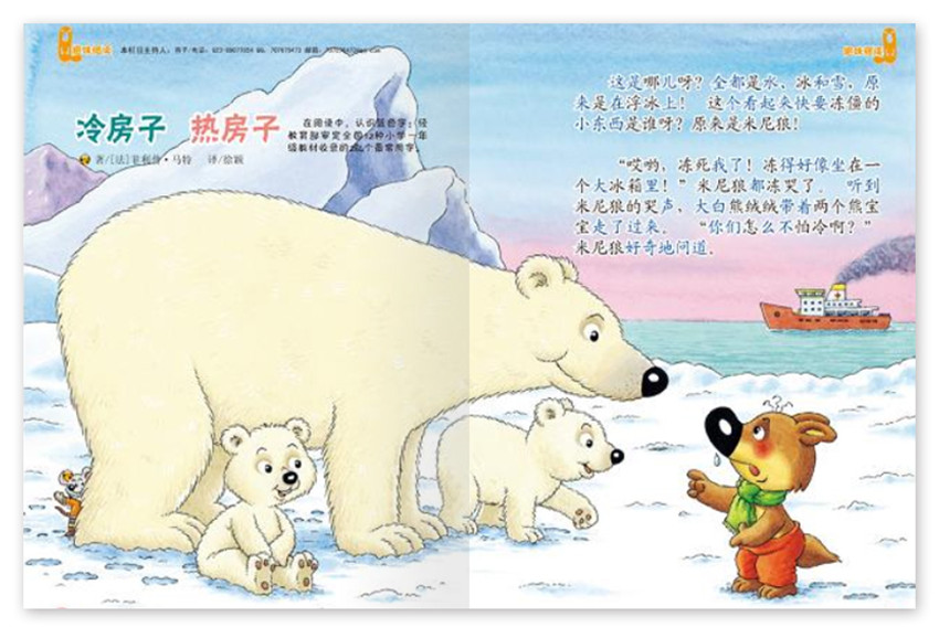 這是哪兒呀? 全都是水、冰和雪。原來是在浮冰上! 這個看起來快要凍僵的,小東西是誰呀?原來是米尼狼!“哎喲,凍死我了!凍得好像坐在一個大冰箱里!”米尼狠都凍哭了。聽到米尼狼的哭聲,大白熊絨絨帶著兩個熊寶寶走了過來,“你們怎么 不怕冷啊?”米尼狼好奇地問道。