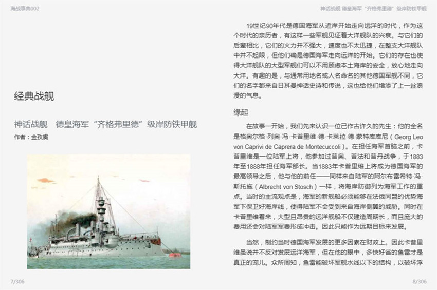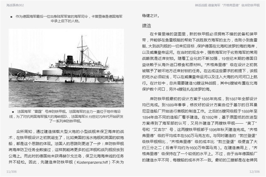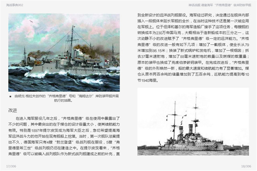 在德國(guó)海軍從小到大、從弱到強(qiáng)的歷史里,“齊格弗里德”級(jí)岸防鐵甲艦既是親歷者,也是旁觀者。大批合格的海軍官兵從“齊格弗里德”級(jí)上走下,來到其他的新戰(zhàn)艦上。它們的兢兢業(yè)業(yè)讓我們發(fā)現(xiàn)了積沙成塔的力量,《神話戰(zhàn)艦:德皇海軍“齊格弗里德”級(jí)岸防鐵甲艦》從“緣起”、“建造”、“技術(shù)指標(biāo)”、“改進(jìn)”、“歷史”數(shù)方面細(xì)敘了這組以日耳晏神話史詩(shī)和傳說命名的岸防鐵甲艦,文中還穿插了一些命名的背景故事,圖文薈呈,頗具浪漫氣息。