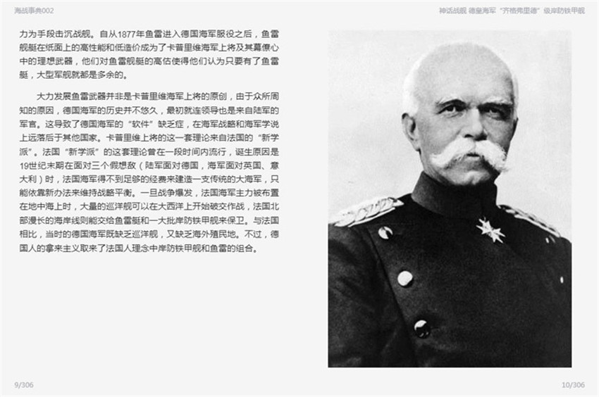 大力發(fā)展魚雷武器并非是卡普里維海軍上將的原創(chuàng),由于眾所周知的原因,德國(guó)海軍的歷史并不悠久,初就連領(lǐng)導(dǎo)也是來自陸軍的軍官。這導(dǎo)致了德國(guó)海軍的”軟件”缺乏癥,在海軍戰(zhàn)略和海軍學(xué)說上遠(yuǎn)落后于其他國(guó)家??ㄆ绽锞S上將的這一套理論來自法國(guó)的“新學(xué)派"法國(guó)“新學(xué)派”的這套理論曾在一段時(shí)間內(nèi)流行,誕生原因是19世紀(jì)末期在面對(duì)三個(gè)假想敵(陸軍面對(duì)德國(guó),海軍面對(duì)英國(guó)、意大利)時(shí),法國(guó)海軍得不到足夠的經(jīng)費(fèi)來建造一支傳統(tǒng)的大海軍,只能依靠新辦法來維持戰(zhàn)略平衡。一旦戰(zhàn)爭(zhēng)爆發(fā),法國(guó)海軍主力被布置。