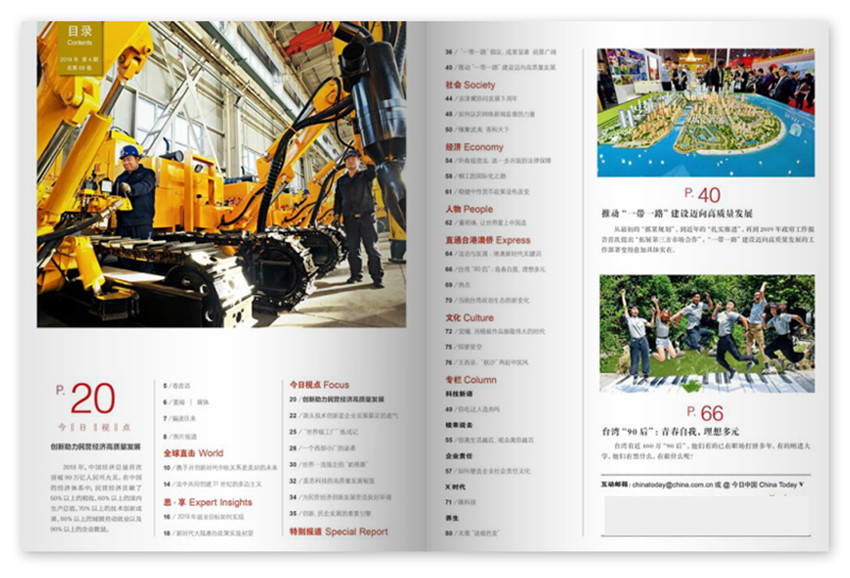 《今日中國》雜志,(月刊),是面向全國發(fā)行的外語類期刊,雜志擁有獨到的思維與敏銳的眼光,使得雜志成為眾多國際大品牌客戶重視的核心媒體之一。從生活入手,以民間身份、及時、深度地報道當(dāng)代中國的經(jīng)濟(jì)文化社會現(xiàn)象。它在臺港澳人士及大陸讀者中享有較高的聲譽(yù),積極溝通兩岸四地之間的信息、增進(jìn)交流、了解與親情,主要讀者對象為投資、工作、學(xué)習(xí)、生活的臺港澳人士為主,兼顧世界各地的華人華僑。