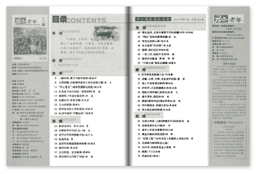《開(kāi)心·老年》主要欄目:生活、康壽、卷首、故事、情趣、在線等。
