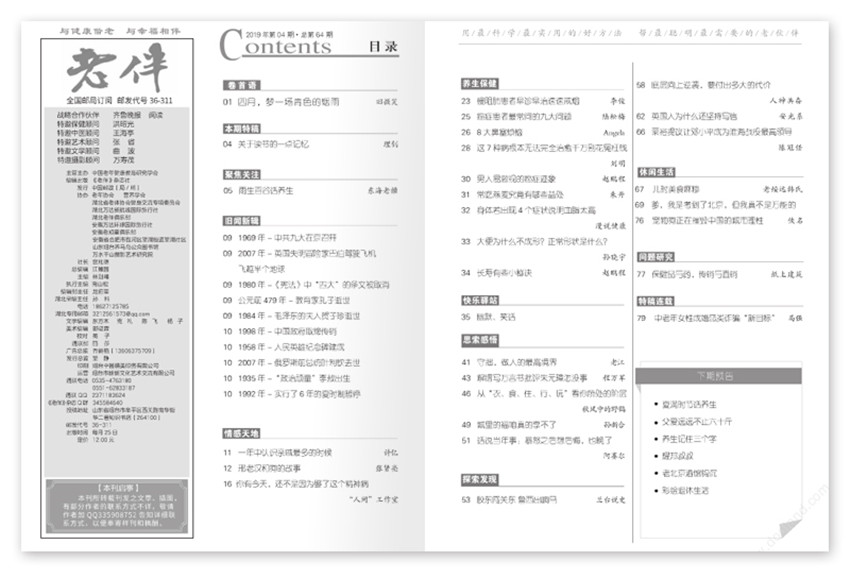 《老伴》月刊,單期100頁,《老伴》雜志以全心全意為老年讀者服務(wù)為宗旨,以老年群體中的知識分子為對象,以思老年人所思,想老年人所想為特點,傾力打造的中國老年人品牌雜志。