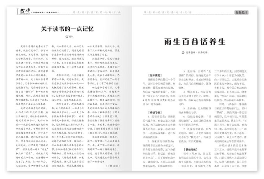 面向50歲以上知識分子讀者群體,用知識、智慧、機敏的水平和眼光,去洞察、洞悉、洞穿平常生活中的涉老話題,用平實、平和、平緩的語言,來講述感人的故事、深刻的道理、實用的知識、趣味的生活、廣闊的視野、健康的情懷、和美的家庭、融洽的友情、史料的探究、才藝的展示、心情的傾訴。