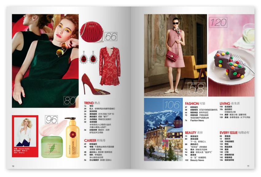 本便攜式高端時(shí)尚生活刊物,專(zhuān)為中國(guó)商務(wù)女性提供品質(zhì)生活服務(wù)和指南,主要欄目:潮流Trend、時(shí)裝Fashion、職場(chǎng)Career、美身體Body&Beauty、自我Spirit、在生活Living等。