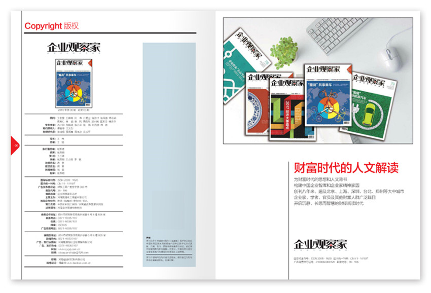 《企業(yè)觀察家》創(chuàng)辦于2011年,月刊,單期128頁(yè),《企業(yè)觀察家》雜志是本以“企業(yè)家人文讀本”為主題面向國(guó)內(nèi)外公開(kāi)發(fā)行的綜合類高端財(cái)經(jīng)雜志,雜志力求構(gòu)建中國(guó)企業(yè)智庫(kù)和企業(yè)家精神家園,努力打造成中國(guó)企業(yè)家案頭必備的財(cái)經(jīng)讀本。