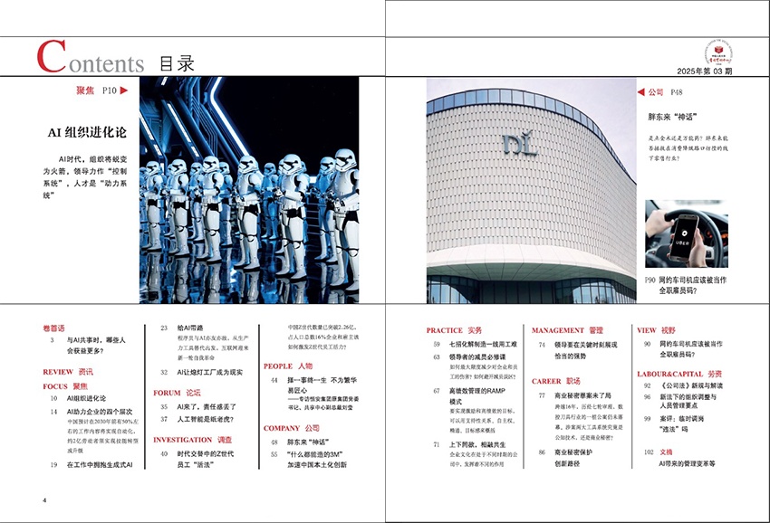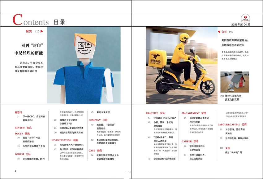 雜志內(nèi)容涵蓋組織行為、人才測評、薪酬體系、績效管理、員工關(guān)系等全模塊,既深入解析勞動政策法規(guī),也持續(xù)追蹤人工智能招聘、靈活用工模式等行業(yè)新趨勢。每期通過案例剖析、專家訪談、調(diào)研報告等形式,為讀者提供系統(tǒng)化知識體系和可落地的解決方案。其特色欄目“企業(yè)人力資源診斷”通過對真實場景的深度解析,已成為業(yè)內(nèi)廣泛借鑒的實用工具平臺。