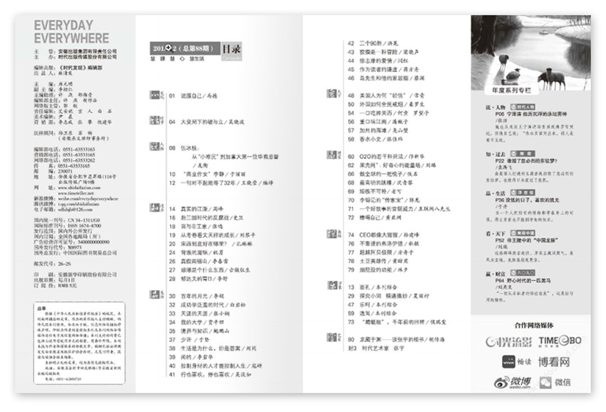 《時(shí)現(xiàn)》雜志以智慧的力量引領(lǐng)生活,以人性的溫暖感號心靈,以優(yōu)美的文本親近讀者,追求“清爽、清亮、清白、輕松”的風(fēng)格,堅(jiān)持以“快樂發(fā)現(xiàn)、品鑒生活、涵養(yǎng)心靈”為閱讀的最終價(jià)值取向,共享新的時(shí)代,新的發(fā)現(xiàn),新的生活,新的知識。