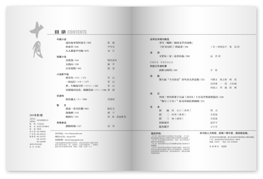 《十月》創(chuàng)辦于1978年,雙月刊,單期246頁,《十月》雜志著重刊登內(nèi)容堅實、風格多樣的中篇小說和品位高雅、文筆優(yōu)美的散文,同時也發(fā)表的長、短篇小說、詩歌、報告文學,對廣大讀者所關(guān)注的熱點題材的作品優(yōu)先刊登。
