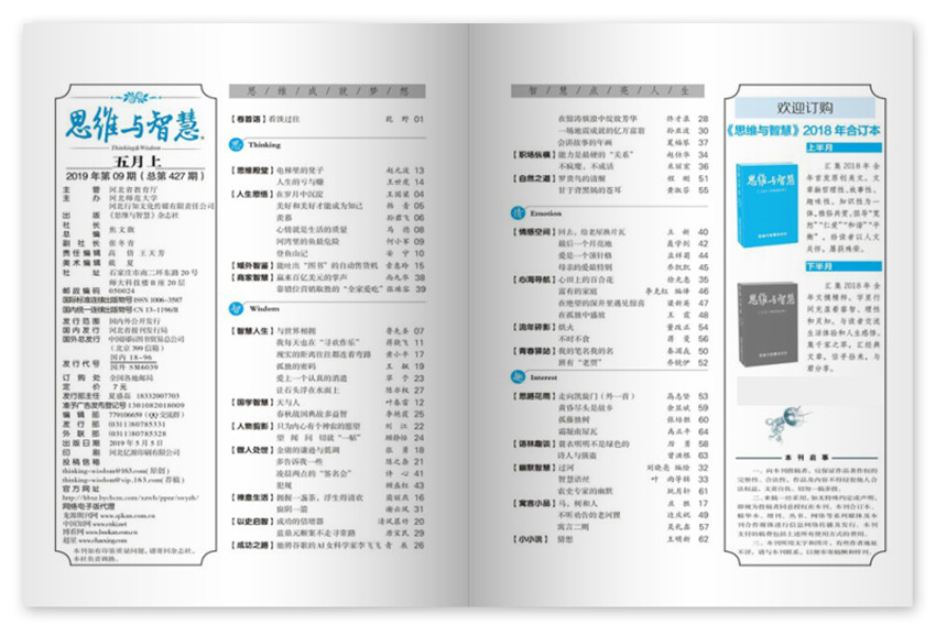 《思維與智慧》,創(chuàng)刊于1982年,期望通過自身在傳播領(lǐng)域的資源優(yōu)勢(shì),給我們帶來高品質(zhì)生活,紙張開本:16開,國(guó)內(nèi)刊號(hào):CN:13-1196/B。內(nèi)容豐富,文筆優(yōu)美:雜志有欄目思、情、趣、這些欄目各有不同的定位與內(nèi)容,內(nèi)容很豐富,從各個(gè)方面為讀者提供人生中的道理,而且文章文筆優(yōu)美,可以說是為廣大讀者奉獻(xiàn)了一份精美的文化大餐。