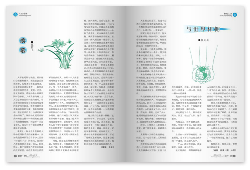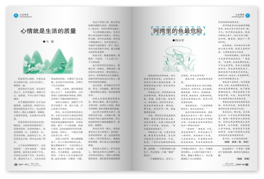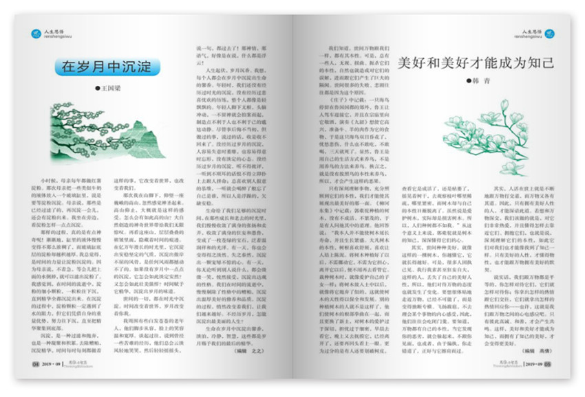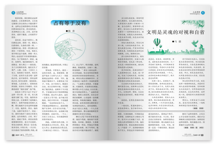 《思維與智慧》內(nèi)容豐富,文筆優(yōu)美:雜志有欄目思、情、趣、這些欄目各有不同的定位與內(nèi)容,內(nèi)容很豐富,從各個(gè)方面為讀者提供人生中的道理,而且文章文筆優(yōu)美,可以說是為廣大讀者奉獻(xiàn)了一份精美的文化大餐。