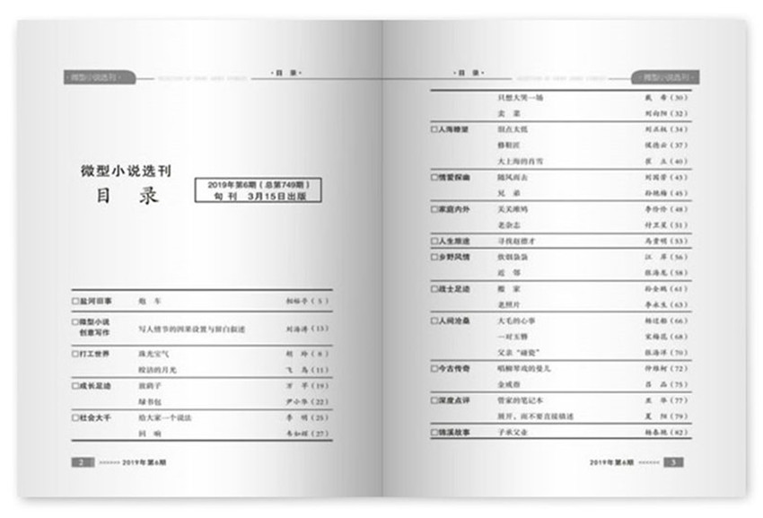 《微型小說選刊》主要欄目:校園春科、都市擷奇、社會大寫真、辛辣酒家、情愛探幽、街頭巷尾、人海了望、人生旅途、國外珍品、創(chuàng)作園地、記者之聲、刊名題字等。