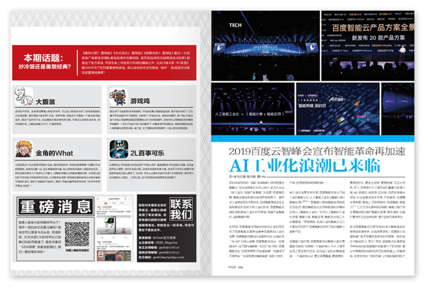 《極客Geek》用新潮的語言,流行時(shí)尚雜志的視覺風(fēng)格來展示內(nèi)容,帶給讀者流暢的閱讀快感。以電腦硬件玩家為主要受眾人群,全面報(bào)道電腦硬件市場與產(chǎn)品的普及性雜志。