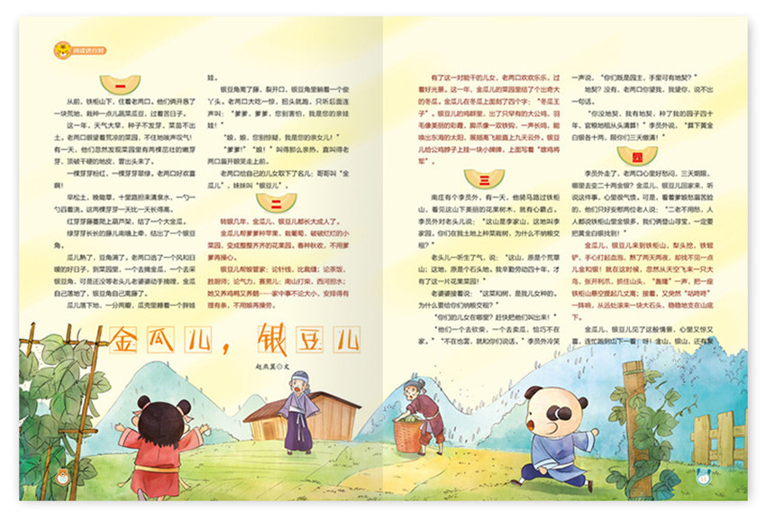 來人啊,把冬瓜、公寓給我收回去!”管家跟班一聲城,抱去了大各盾,搶走了大公雞。金瓜兒、銀豆兒回到家,只見爹爹嘆氣,娘抹淚,一一問原因,才知道是李員外奪走了支山冬瓜、抓山公雞。兄妹倆怒火心頭起:”李員外這只老狼,我們追上前去,和他評(píng)一評(píng)理!”說罷,金瓜兒提上犁頭,銀豆兒拿起扁擔(dān),兄妹倆出了門,直向大路上追趕。