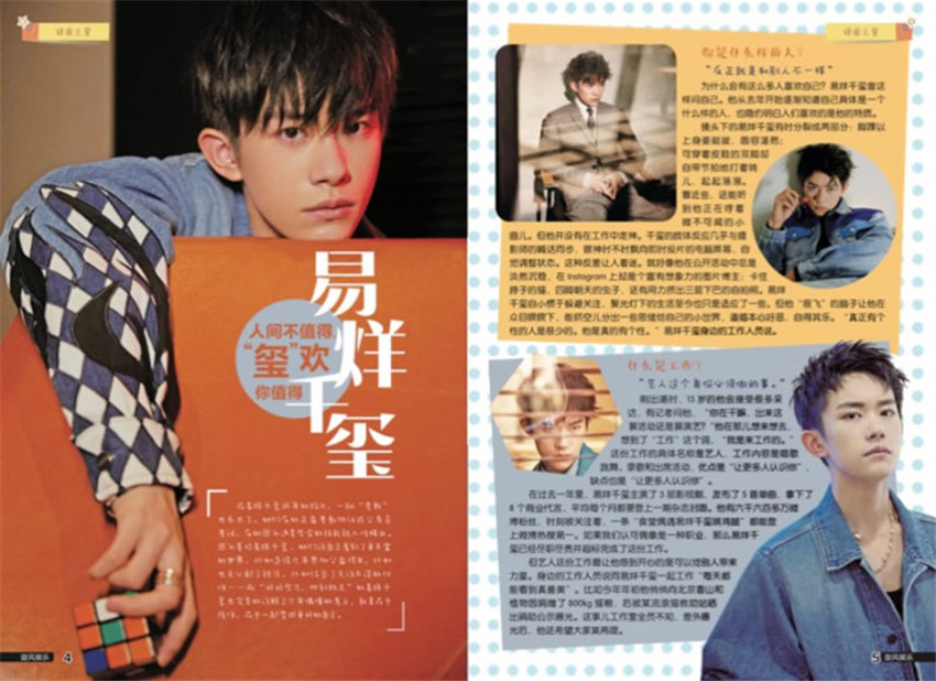 易烊千璽,2000年11月28日生于湖南懷化,中國內(nèi)地男歌手、舞者、演員,TFBOYS成員,就讀于中央戲劇學(xué)院。2005年,首登電視熒屏,開始參演各類綜藝節(jié)目。2009年,加入“飛炫少年”組合,兩年后退出。2013年6月,獲邀加入TF家族;8月,以TFBOYS形式出道,2015年10月,為《小王子》男主角配音,該片刷新法國動畫電影在華票房紀錄。11月,表演自編舞蹈《IFYOU》和《RHYTHMTA》,創(chuàng)下愛奇藝生日會直播在線用戶數(shù)據(jù)高紀錄。