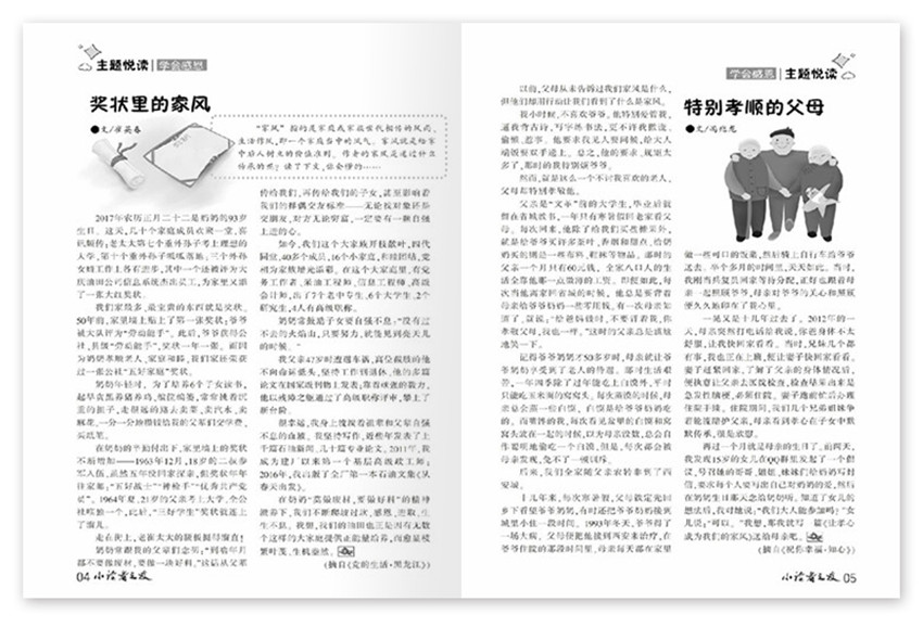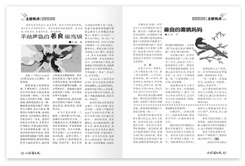 《小讀者之友》創(chuàng)刊于2018年,始終堅持“學(xué)生學(xué)語文學(xué)做人的幫手,教師教語文教做人的助手”的辦刊理念,以“小讀者的心靈讀本”為追求目標(biāo),始終關(guān)注小讀者的心靈成長與閱讀需求,讓小讀者在有效的閱讀過程中,觀世界、品人文,學(xué)語文、樂成長,在廣博的知識中涵養(yǎng)心靈,在愛的故事里呵護(hù)童心。讓孩子在閱讀的過程中,走過筆端萬物、穿越時間智慧,同時培養(yǎng)他們在須臾間思考、于文海間行走的能力,讓小讀者讀出一副好心腸,讀出一副硬骨頭,讀出一個健康的靈魂。和《小讀者之友》一起,與好文章不期而遇。