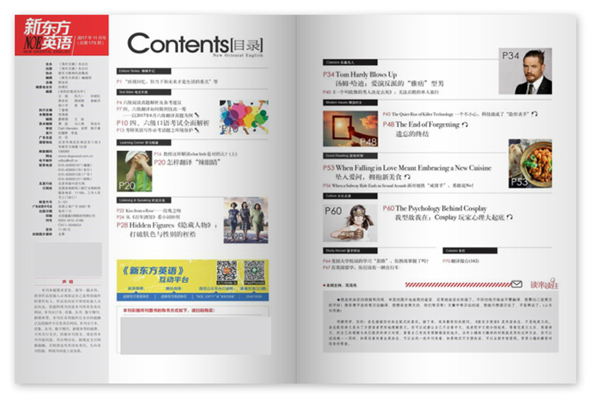 《新東方英語》雜志主要內(nèi)容為實(shí)用的考試技巧輔導(dǎo)、的留學(xué)資訊、系統(tǒng)的異域文化介紹以及雋永的美文賞析。