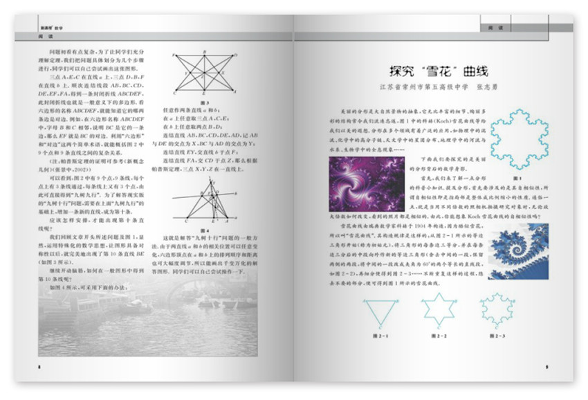 探究“雪花”曲線,美麗的分形是大自然景物的抽象,它無比豐富的細節(jié)、絢麗多彩的結(jié)構(gòu)常令我們流連忘返,圖1中的科赫(Koch)雪花曲線等給我們以美的遐想,分形在多個領(lǐng)域有著廣泛的應(yīng)用,如物理中的湍流、化學(xué)中的高分子鏈、天文學(xué)中的星團分布、地理學(xué)中的河流與水系、生物學(xué)中的全息現(xiàn)象……首先,我們來了解一點分形的科普小知識,提及分形,首先要涉及的是其自相似性,所謂自相似性即是指局部是整體成比例縮小的性質(zhì)。