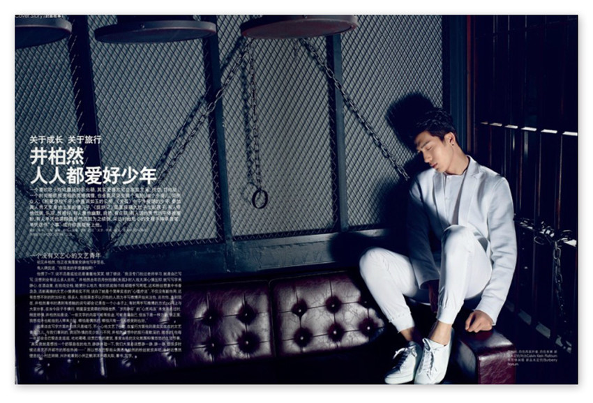 井柏然人人都愛(ài)好少年,一個(gè)喜歡吃小雞燉蘑菇的東北萌,其實(shí)更喜歡宅在家里發(fā)呆、放空、打電動(dòng);一個(gè)時(shí)尚圈頻頻亮相的質(zhì)感偶像,也會(huì)畫風(fēng)突變做個(gè)鬼臉、編個(gè)小曲兒,笑倒眾人;《相愛(ài)穿梭千年》中溫潤(rùn)如玉的公明、《失孤》中干凈俊朗的少年,參加真人秀又變身地主家的傻兒子,《捉妖記》里直接搞大肚子生起孩子。有人夸他低調(diào)、樂(lè)觀、性格好,有人愛(ài)他幽默、自然、有點(diǎn)萌,有人因他秀氣的字體被圈粉,有人單憑他高顏值好氣質(zhì)就為之傾倒,采訪時(shí)他貼心的全程手捧錄音筆,單憑這件“小事”或許你就能愛(ài)上他。