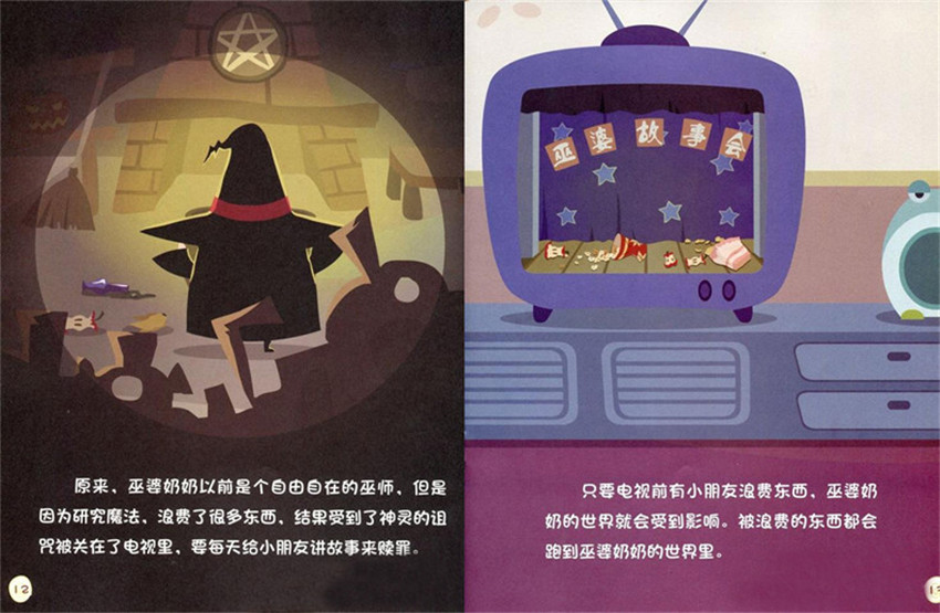 原來、巫婆奶奶以前是個目由自在的巫怖,但是因為研究魔法,浪費了很多末西、結(jié)果受到了神靈的沮咒被關(guān)在了電視里、要每天給小朋友講故事來贖罪。只要電視前有小朋友浪費東西,巫婆奶奶的世界就會受到影響。被浪費的東西都會跑到巫婆奶奶的世界里。