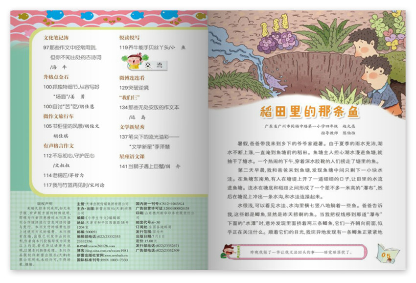 《小學(xué)生作文》,創(chuàng)刊于1981年,期望通過自身在傳播領(lǐng)域的資源優(yōu)勢(shì),給我們帶來高品質(zhì)生活,紙張開本:32開,國內(nèi)刊號(hào):CN:12-1043/G4。欄目新穎、形式活潑,文字清新,深受廣大專家、家長和小讀者的喜愛,這里有精彩的原創(chuàng)佳作,這里有點(diǎn)穴的名師講評(píng),這里有實(shí)用的寫話指導(dǎo),這里有豐富的互動(dòng)課堂……