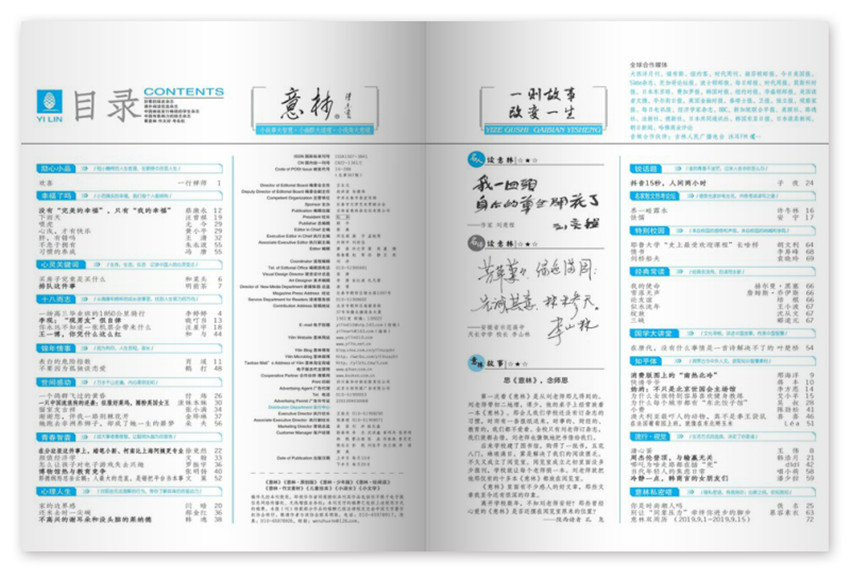 《意林》創(chuàng)辦于2003年,半月刊,單期72頁,《意林》是中國目前比較有影響力的雜志之一,雜志的內(nèi)容風(fēng)格現(xiàn)實(shí)溫暖,通常用一些故事和生活經(jīng)歷來吸引讀者。在價(jià)值觀的宣傳上強(qiáng)調(diào)勵(lì)志和人文關(guān)懷,是我國雜志類中的佼佼者。