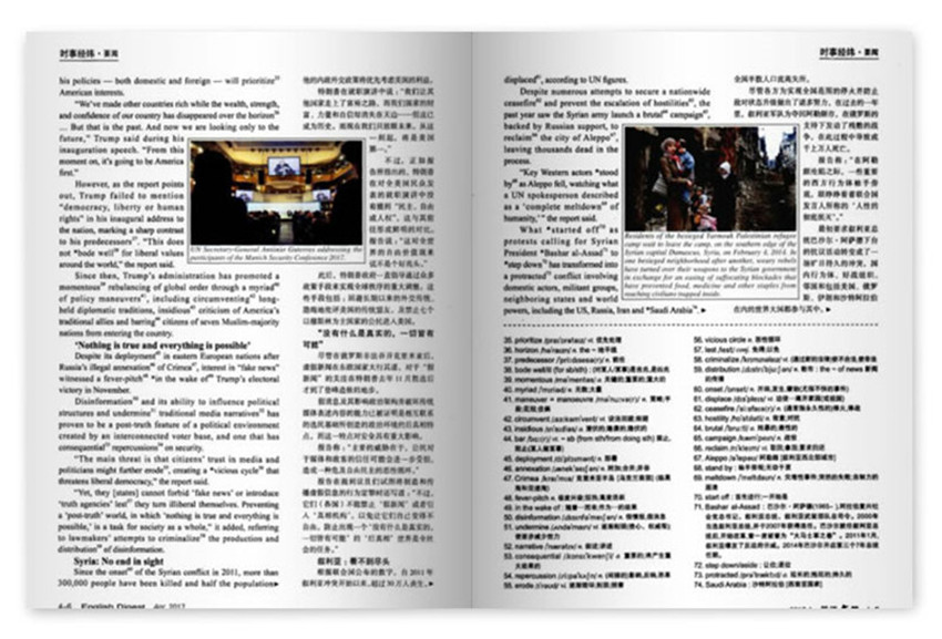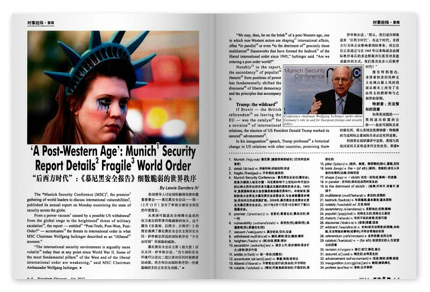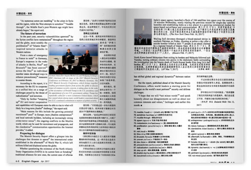 《英語文摘》主要欄目:財經視窗、科技前沿、時事經緯、環(huán)球人物、寰宇新知等。