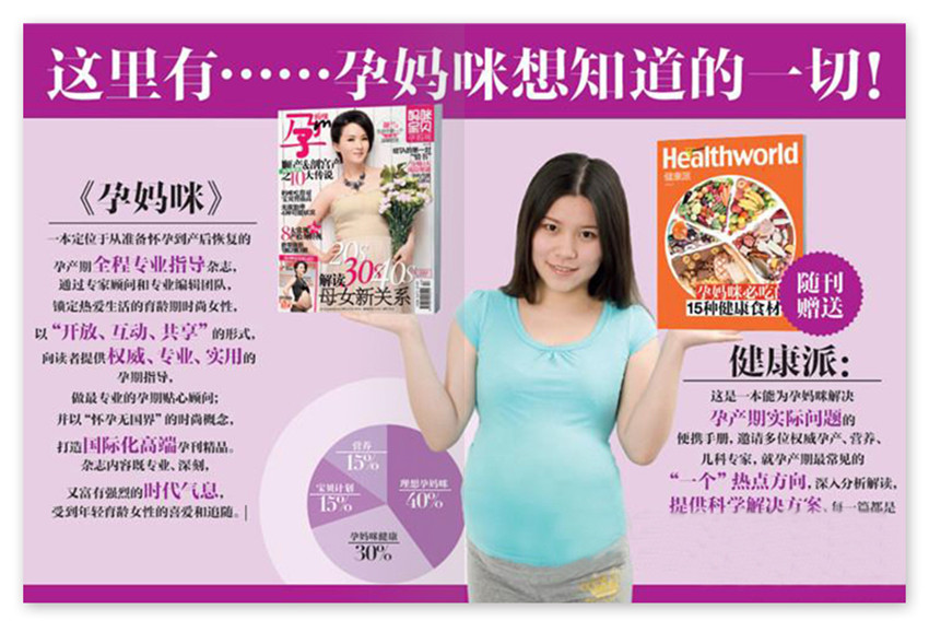 《孕媽咪》雜志鎖定熱愛(ài)生活的育齡期時(shí)尚女性,以“開(kāi)放、互動(dòng)、共享”的形式,向讀者提供、專業(yè)、實(shí)用的孕期指導(dǎo),做最專業(yè)的孕期貼心顧問(wèn);并以“懷孕無(wú)國(guó)界”的時(shí)尚概念,打造國(guó)際化高端孕刊精品。雜志內(nèi)容既專業(yè)、深刻,又富有強(qiáng)烈的時(shí)代氣息,受到年輕育齡女性的喜愛(ài)和追隨。