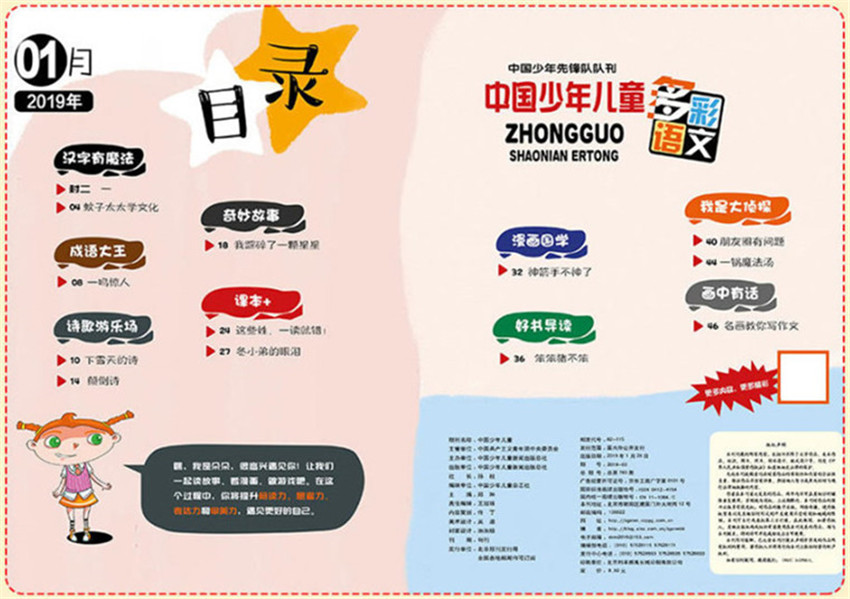 《中國少年兒童》主要欄目:漢字有魔法、成語大王、詩歌游樂場、奇妙故事、課本、畫中有話等。