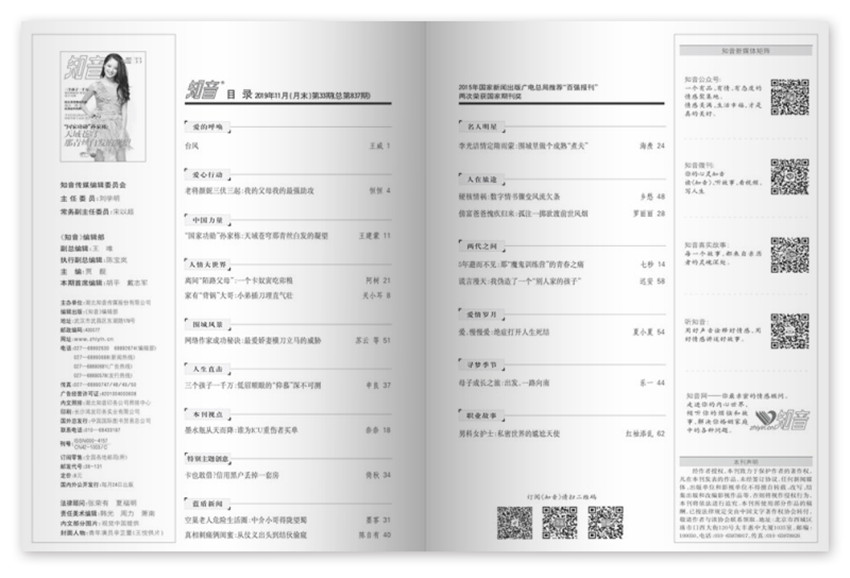 《知音》雜志中充滿了咱們老百姓的平凡中見(jiàn)不平凡的感情和愛(ài)情故事,相濡以沫,白頭偕老,風(fēng)雨人生,以痛苦見(jiàn)證堅(jiān)貞,以堅(jiān)貞見(jiàn)證偉大,以偉大見(jiàn)證幸福。