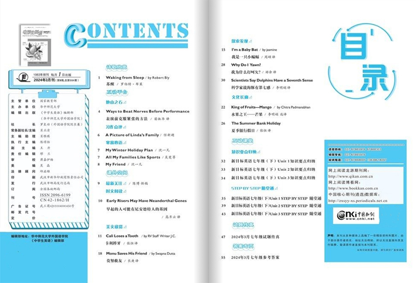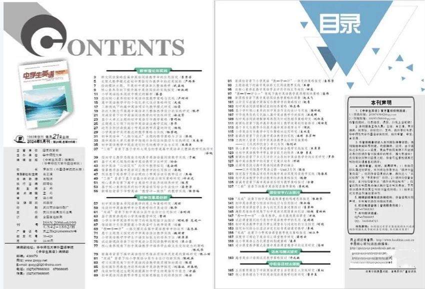 《中學生英語》雜志歷經(jīng)時代變遷,始終以服務中學英語教育為核心。雜志現(xiàn)為旬刊,國內(nèi)統(tǒng)一刊號CN 42-1052/H,國際刊號ISSN 1003-6822,被中國知網(wǎng)、《萬方數(shù)據(jù)—數(shù)字化期刊群》等權威數(shù)據(jù)庫全文收錄,并入選《中國核心期刊(遴選)數(shù)據(jù)庫》,獲評國家新聞出版總署質(zhì)量檢測優(yōu)秀刊物,學術影響力輻射全國。