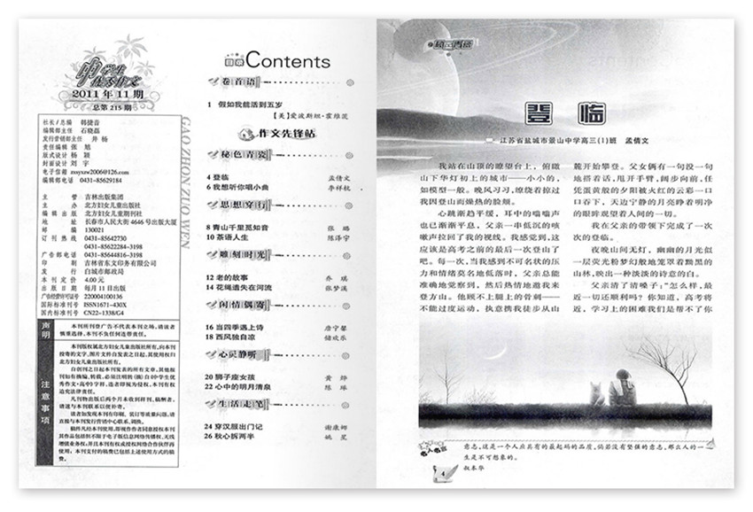 提倡“說真話,做真人”為辦刊宗旨,故深受中學(xué)師生歡迎,主要欄目:金素材、時文素材、名校作文、作文講堂、在路上、作文素材實戰(zhàn)點擊、滿分作文讀解、新格言等。